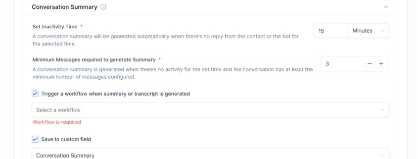 You can now automatically generate conversation summaries and full transcripts for every Conversation AI session. This provides you with instant visibility, auditability, and actionable insights derived from AI-driven conversations. Summaries are intelligently generated based on inactivity, bot sleep events, or session boundaries, and can be saved to contact records, trigger workflows, or sent via email—no […]