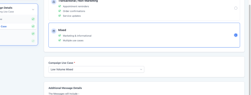 Overview: We’ve introduced a new Mixed Use Case option in the Chat Widget A2P registration flow, allowing businesses to collect separate marketing and informational consent through a single widget. A new Mixed message type is now available alongside Marketing/Promotional and Transactional/Non-Marketing in the Chat Widget flow. When selected, the campaign use case is automatically set […]
