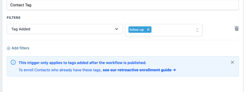 /in What's New? AutomationsWe have introduced two in-context safeguards to the Contact Tag trigger to prevent common configuration errors and protect users from unexpected workflow behaviour. Retroactive Enrollment Info Banner When a tag is added to the Contact Tag trigger, a subtle info banner now appears, clarifying that the trigger only applies to tags added after the workflow […]