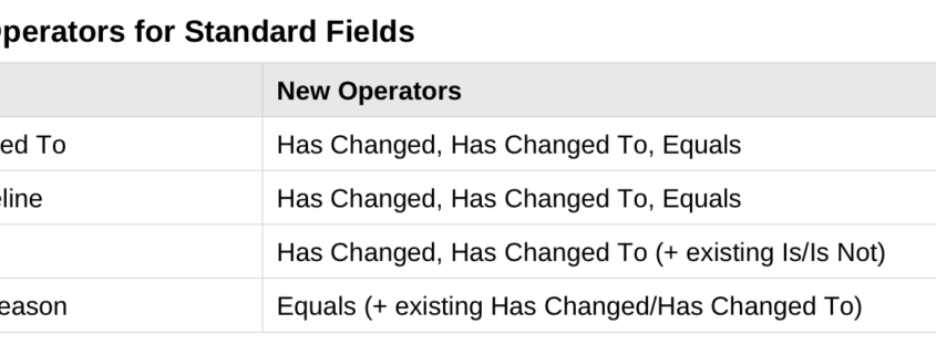 The Opportunity Changed trigger now supports event-based operators. Previously, this trigger functioned as a filter, activating for any change in opportunities that matched specific field values. With the introduction of the Has Changed and Has Changed To operators, you can now initiate workflows only when a specific field actually changes. New Operators for Standard Fields […]