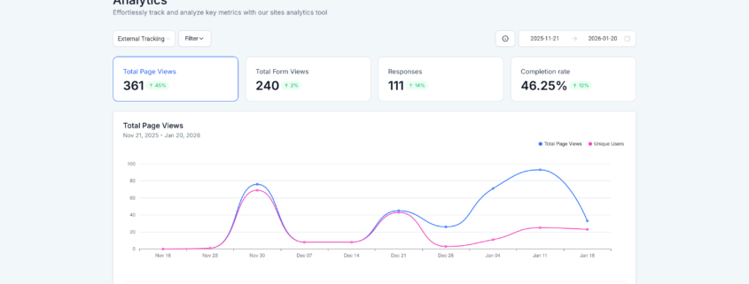We’ve introduced Analytics for External Tracking, providing users with native visibility into visitor behaviour on externally hosted sites and forms (both native and HTML-based). This release includes a centralised analytics dashboard to monitor page views, form views, responses, and completion rates, complete with detailed filtering and audience breakdowns. Added a new Analytics button within the […]