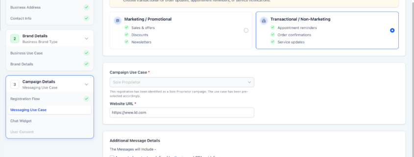 /in What's New? Chat WidgetOverview: We have extended the Chat Widget A2P registration process to accommodate Sole Proprietor accounts, featuring automatic use case detection and pre-filled templates. What’s New: Sole Proprietor registrations are now automatically detected within the Chat Widget flow. When identified, the campaign use case is pre-selected. Users can still choose their message type — Marketing/Promotional or […]